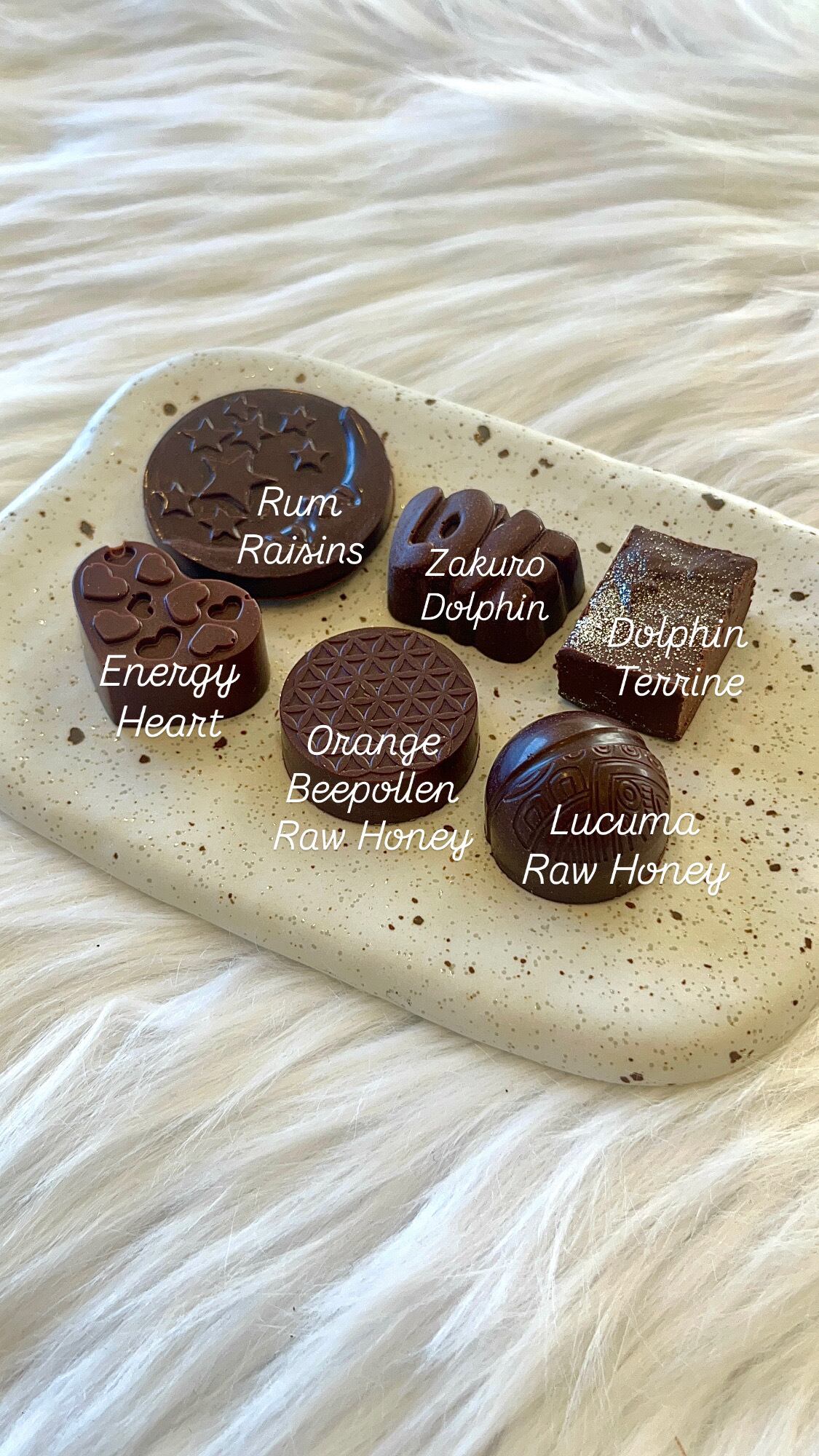 有機ローカカオマス、有機カカオバター、生蜂蜜(レザーウッド、ワイルドフラワー)、有機ルクマ、ビーポーレン 、種扇糖、天然香料(ノンアルコールラム、オレンジ)、有機レーズン、有機オーツミルク、バニラビーンズ、ザクロパウダー、イルカエッセンス、食用銀粉、岩塩